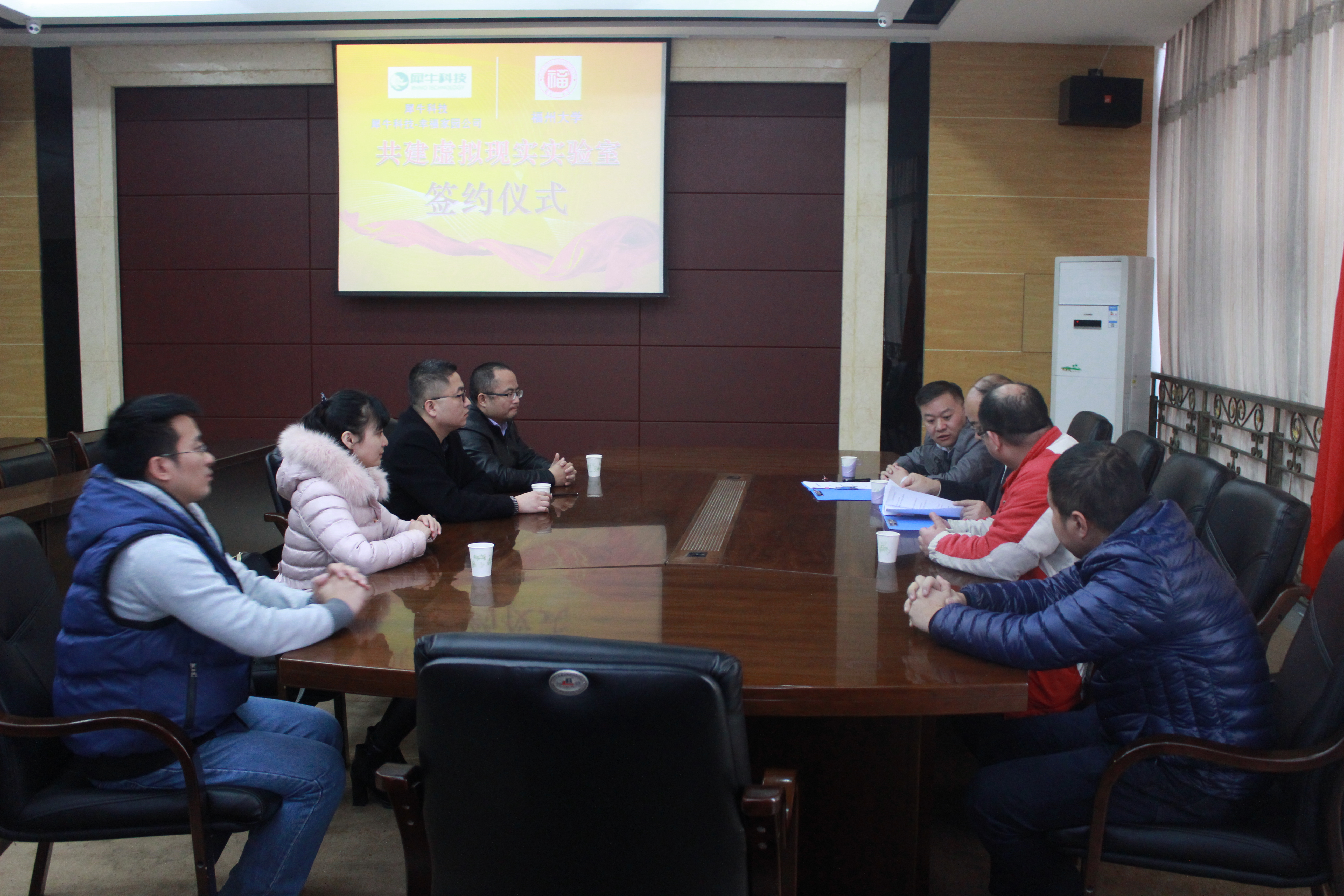 首先由学院副院长何炳蔚老师给大家简要介绍了共建虚拟现实实验室合作项目的准备情况和今后开展的合作方向,接着参会人员对合作内容进行了详细的讨论交流,最后三方代表分别在合作协议书上签字,其他参会人员作为见证人。