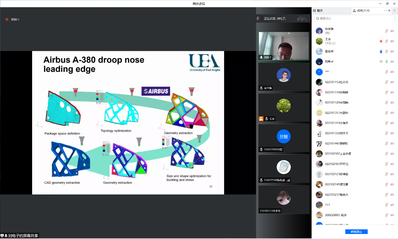 讲座现场,刘教授首先通过航空航天复合材料板的理论计算模型,讲述了优化设计在工业应用领域的重要性,介绍了复合材料的优化策略和结构优化理论,并举例说明优化方法在工程实例中的应用。随后,重点介绍了数字孪生模型、元模型辅助优化、拓扑优化的创新设计、GP/MAM近似建模技术等优化方法在航空航天结构设计与制造中的应用。提问环节,刘教授集中回答了老师和同学们较为关注的RVE模型在拓扑优化中的应用、云模型和数字孪生的区别、如何验证建模的正确性以及拓扑优化中是否考虑到复合材料黏弹性特性等问题。刘教授精彩的报告、深入浅出的讲解、耐心细致的解答,以及谦逊的研究态度得到了大家的一致好评,与会师生纷纷表示受益匪浅。