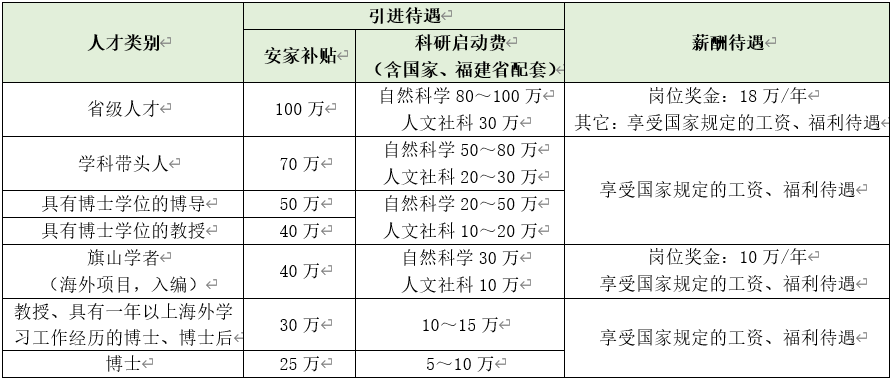 符合《福建省紧缺急需人才引进指导目录》的引进人才,同时享受福建省提供:①生活津贴:2000元/人/月,连续发放五年;②住房补助:博士每人共14万元,正高职称人员每人18万元,每年发放一次,分五年发放。
