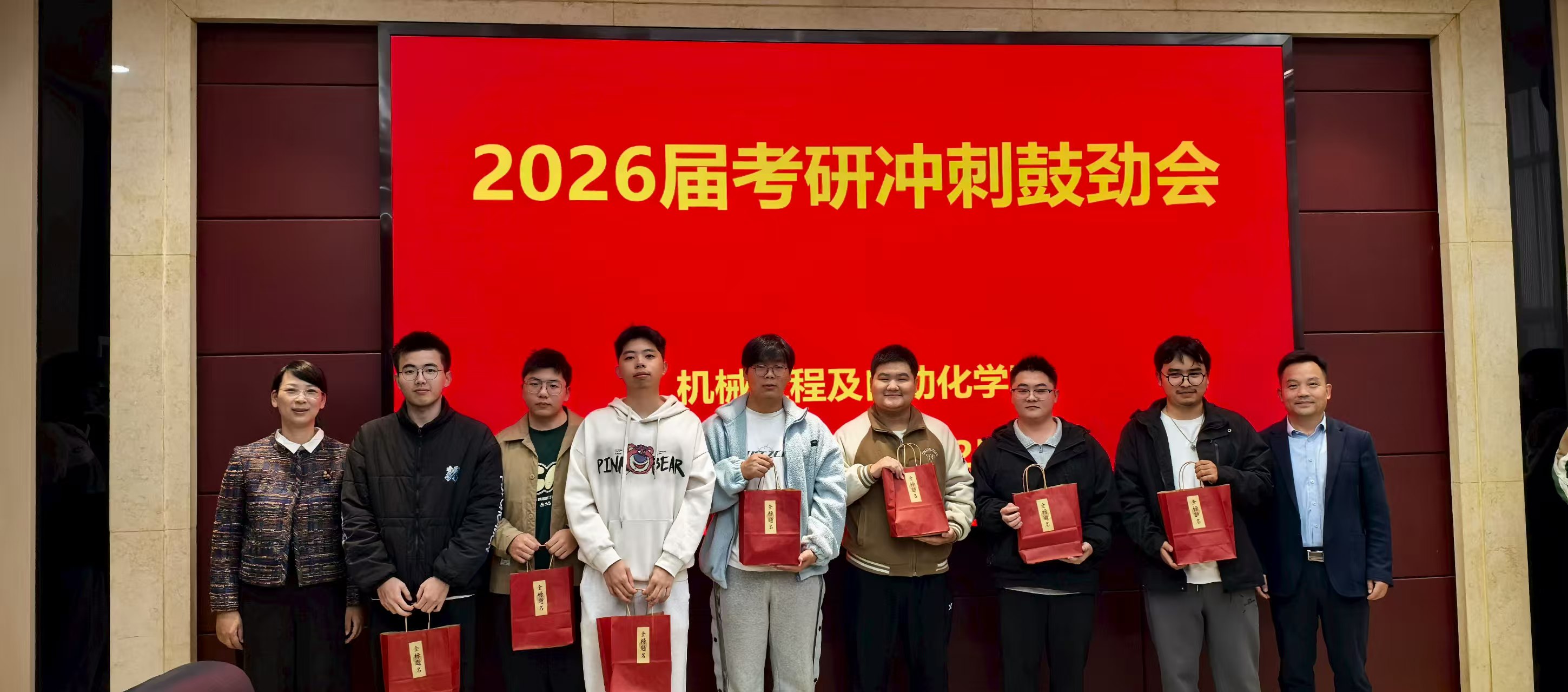 鼓劲会现场还举行了温馨的慰问品发放仪式。学院领导亲手为每一位考研学生代表送上精心准备的“考研金榜题名礼包”,为学子加油鼓劲、提振信心,送上全院师生对2026届考研学子们的真切祝福与美好期盼。