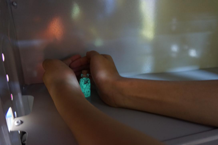 解说志愿者先把全部的操作过程先简单演示一遍,再分发材料,让每个组的志愿者来按照各组人员配比来配备瓶子,胶水,夜光砂,棉签。孩子们一开始相当兴奋,嗷嗷地拿起自己带的水杯子向包有夜光砂的纸上使劲地砸,整个教室都是“砰砰砰”的声音,堪称是整个夏令营最“暴力”的制作活动。最后关上灯的时候,黑乎乎的,唯有各自做好的星空瓶发出蓝色的、绿色的荧光,全场一片尖叫。之后,让同学们用小纸条写下自己的愿望,塞进瓶子里,成了愿望瓶,希望他们的愿望如同夜空中最亮的星般可以闪闪发光。