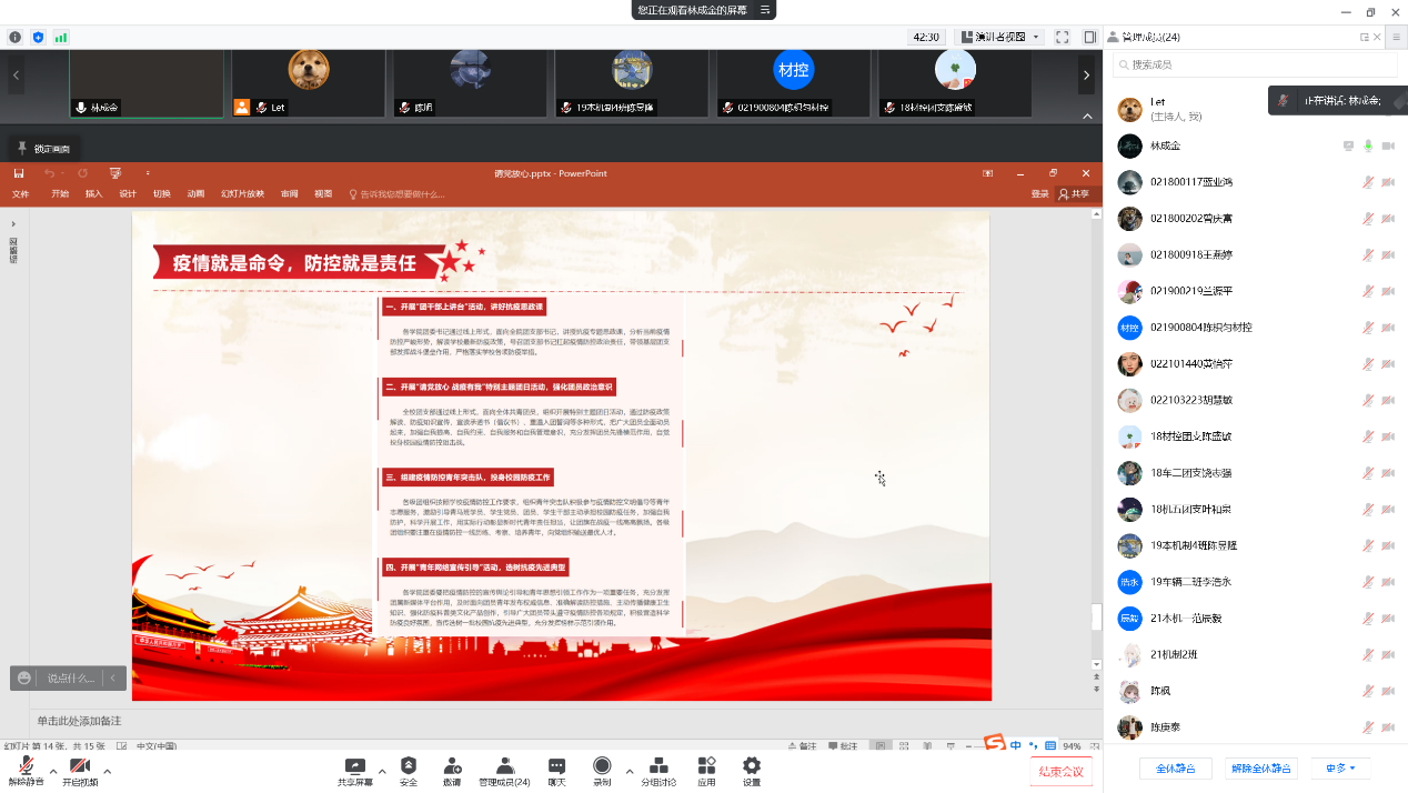 本次会议通过线上与线下相结合的形式,面向全院团支部书记,院团委副书记林成金老师讲授抗疫思政课,具体分析当前疫情防控严峻形势,解读学校最新防疫政策,号召全体团支部书记及全体团员扛起疫情防控责任,起好带头作用,严格落实学校各项防疫举措。