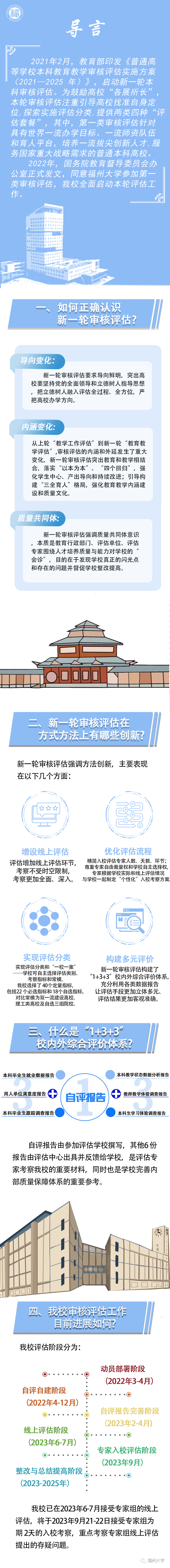 根据教育部教育质量评估中心的总体部署,在前期线上评估的基础上,教育部评估组专家将于2023年9月21-22日深入我校进行第二阶段的入校评估。专家入校评估主要针对线上评估问题清单中的存疑内容,以访谈座谈、调阅资料、听课等方式进行核查佐证。同时,就线上评估无法开展的内容,进行补充考察。作为一名福大人,我们应该熟悉了解哪些内容,做好哪些准备呢,一起来看一下吧。