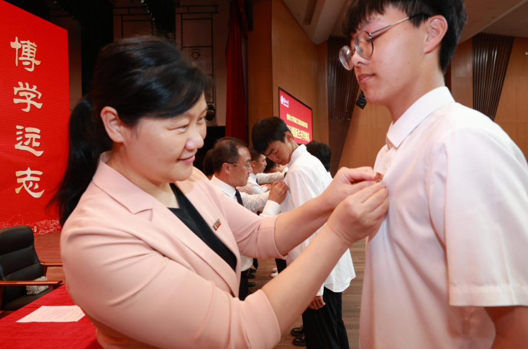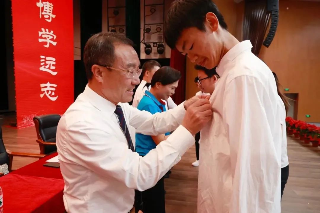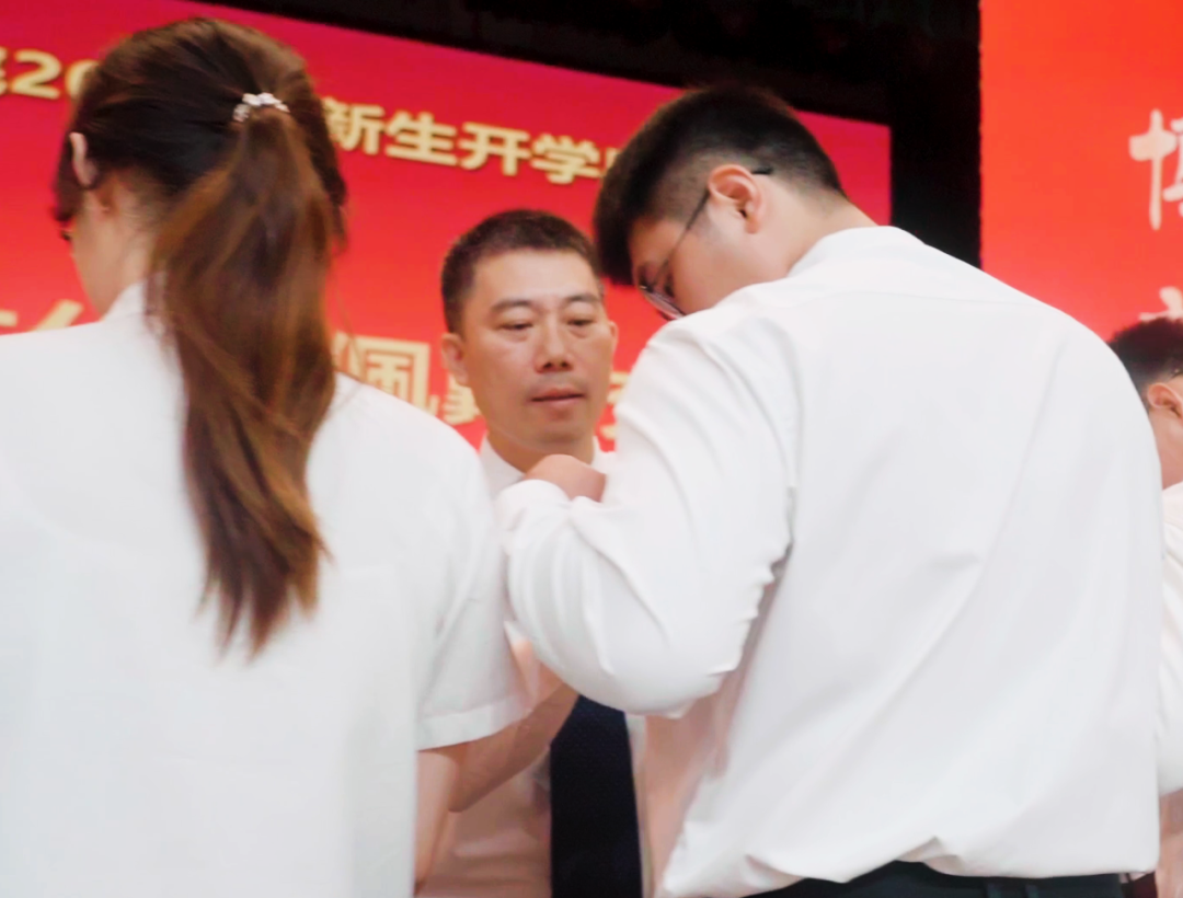 学院领导为新生代表佩戴校徽,希望机械学子秉承91在线