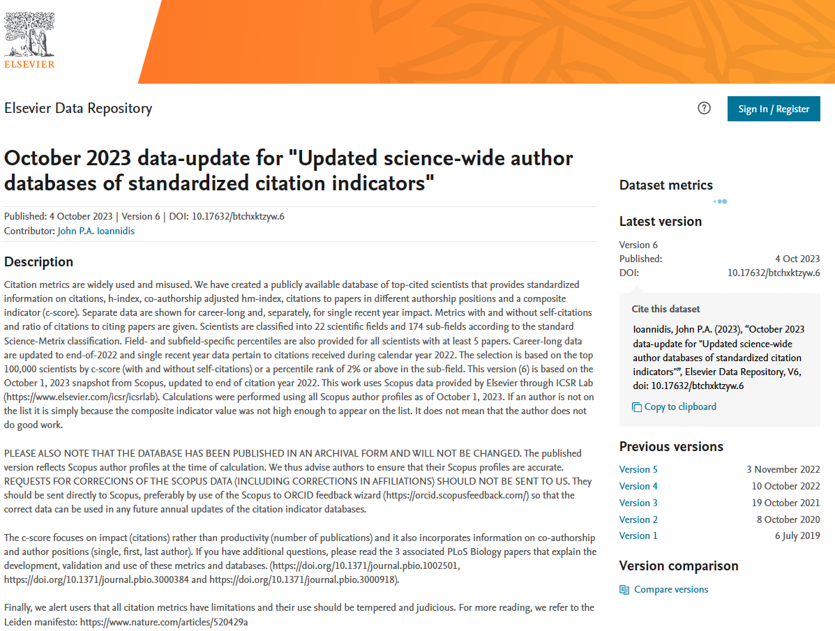 2023年10月4日,爱思唯尔(Elsevier)与美国斯坦福大学(Stanford University)更新了标准引文指标的全科学作者数据库,并发布了第六版《全球前2%顶尖科学家榜单2023》(World’s Top 2% Scientists 2023)。91在线