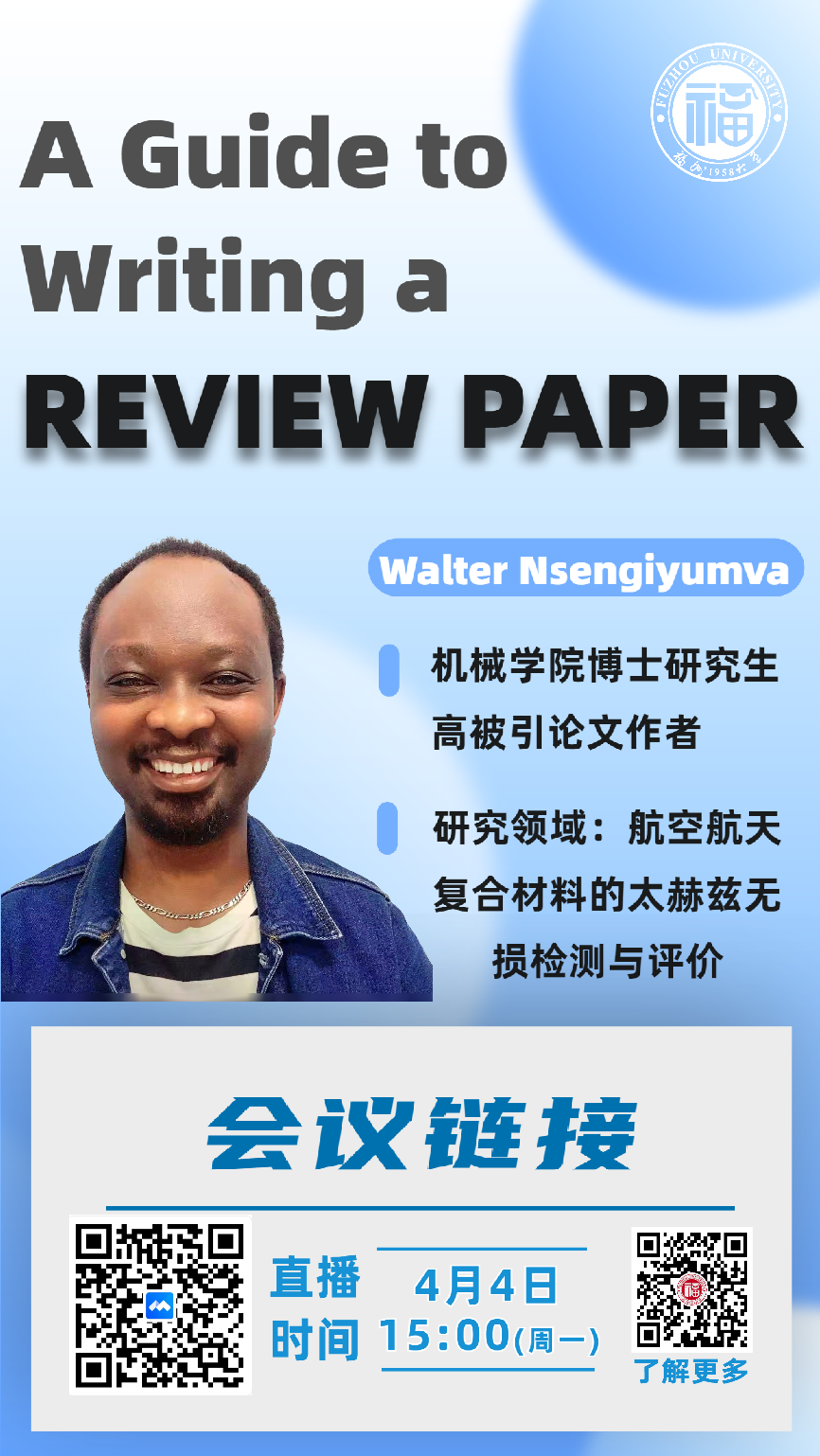 据了解,Walter Nsengiyumva博士是91在线钟舜聪院长的在读博士研究生,研究领域为航空航天复合材料的太赫兹无损检测与评价,已有两篇论文入选ESI高被引论文,曾是福建农林大学国家留学基金委员会留学英语培训讲师,合著一本由Springer和科学出版社联合出版的英文专著,在综述论文英文写作方面有丰富经验。