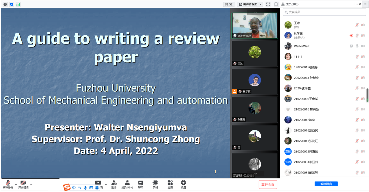 在最后的提问交流环节,与会师生与Walter Nsengiyumva博士进行了积极互动,参会学生纷纷向Walter表示感谢,朴素的语言架起了一座跨越国界的友谊桥。Walter Nsengiyumva博士根据自己的研究经验和心得,向提问师生提供了自己的建议和见解。工欲善其事,必先利其器。撰写综述论文可以激发一个人的研究兴趣,提高一个人的论文写作能力,通过这一次的学术报告,师生们对于如何撰写一篇优秀的综述论文有了更深的认识,让全体参会人员真切地觉得学有所获、研有所得、受益匪浅。
