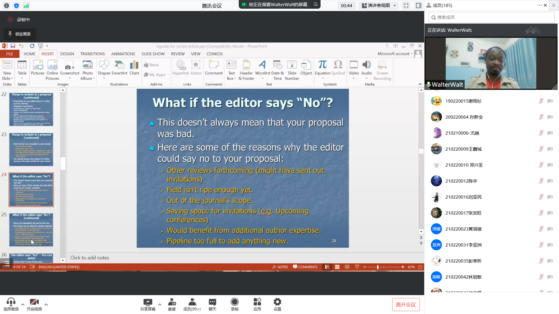 的Walter Nsengiyumva博士带来的“综述论文写作指南”专题学术报告,通过腾讯会议如期举行。报告由王冰研究员主持,180余名师生在线聆听了报告。
